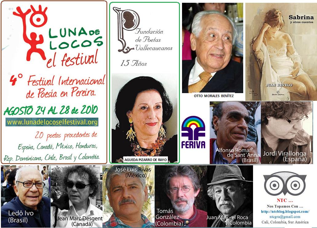 --> Festival de Poesía de Pereira, http://www.lunadelocoselfestival.org/ , http://www.facebook.com/profile.php?id=100001420595950 . Cuarta Versión (24 al 28 de Agosto, 2010*). * PROGRAMACÍON : http://www.lunadelocoselfestival.org/programacion/Programacion2010.pdf . Pereira y su festival de poesía . Por: William Ospina. El Espectador .com 14 Ago 2010 - 11:00 pm http://www.elespectador.com/columna-219134-pereira-y-su-festival-de-poesia . Impreso 15 Ago. 2010. NTC ... ENLACES: 3er Festival Internacional de Poesía de PEREIRA. 2009 , http://ntcpoesia.blogspot.com/2009_08_19_archive.html . / II FESTIVAL DE POESÍA de PEREIRA. Memorias NTC ... , http://ntc-eventos.blogspot.com/2008_08_30_archive.html